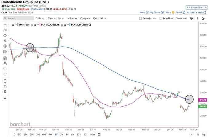 UnitedHealth $UNH forms a Death Cross ☠️ for the first time since January 2025 🤯 The last one sent shares plunging 57% over the next 6 months 📉📉