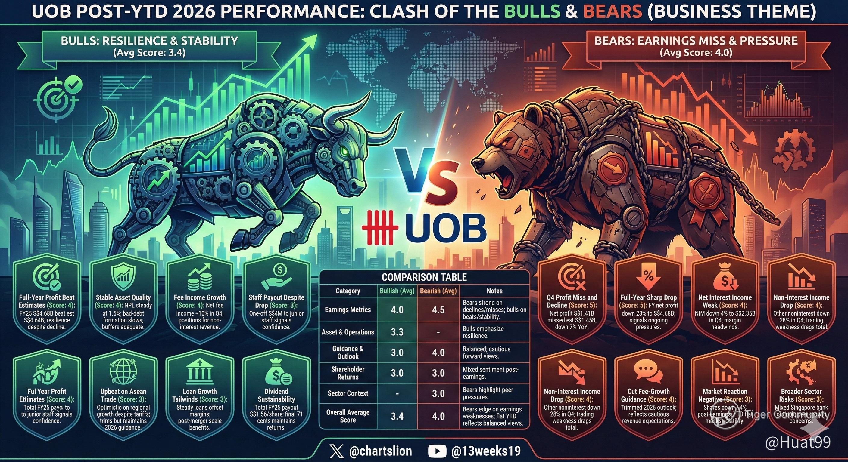 🟢 BULLS (Score 3.4): Pointing to core resilience! UOB beat FY25 net profit estimates at S$4.68B. Asset quality remains rock solid with NPL at 1.5%, Q4 fee income is growing, and they maintained a highly sustainable dividend payout.