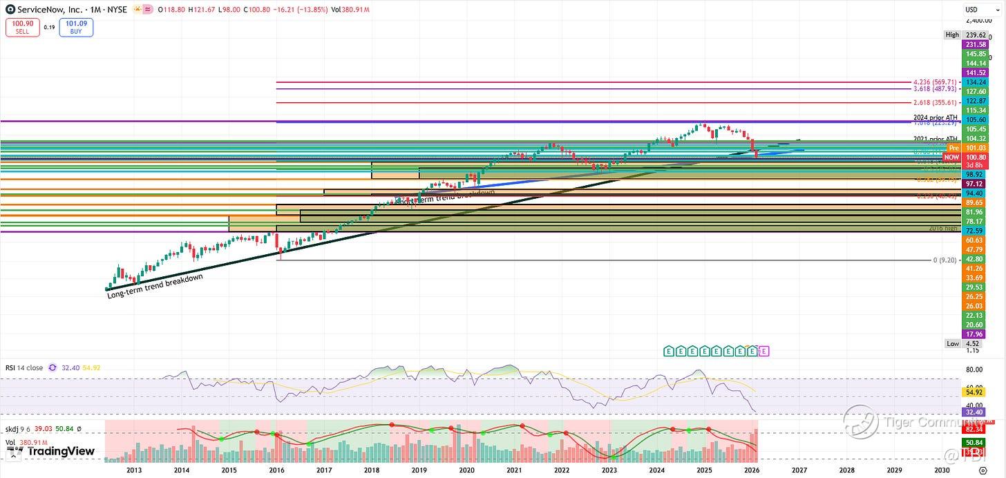 NOW broke down from both its long-term green support trendline and short-term blue support trendline.