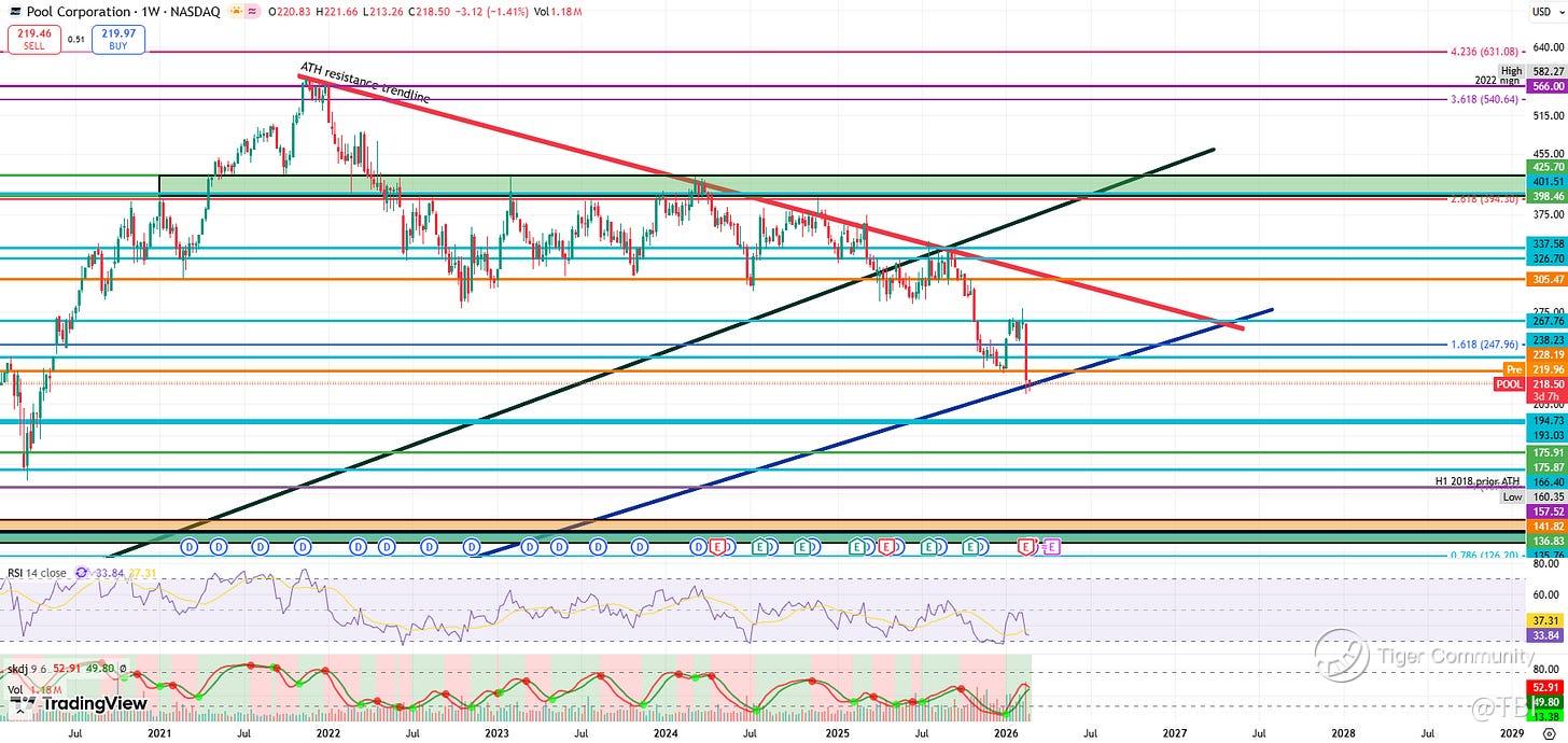 If POOL rejects the 228.19 yearly level, breaks below the support trendline and continues to be faded off the brown resistance trendline, then it could see further downside continuation into the 193-195 quarterly support.