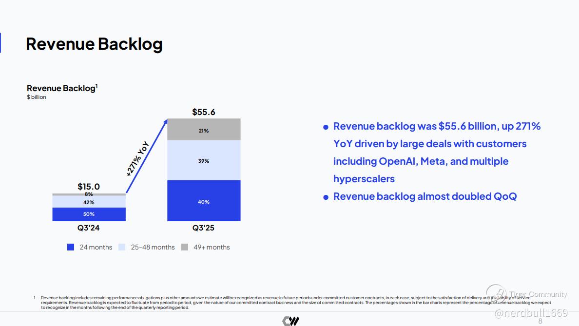 • Revenue Backlog: Nearly doubled to $55.6 billion, driven by massive new contracts with Meta ($14.2B) and OpenAI ($6.5B addition).