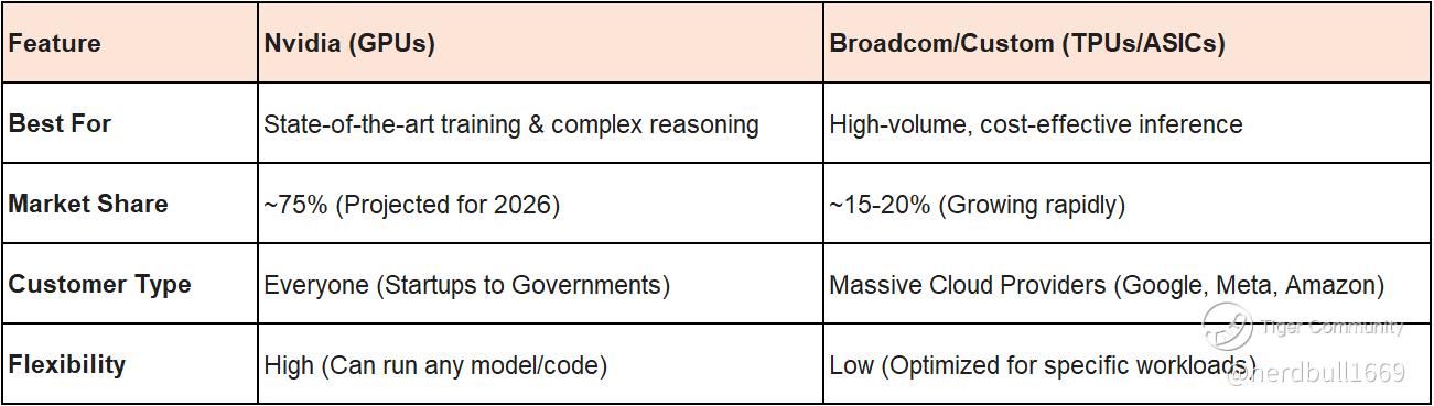 $Broadcom(AVGO)$’s success in securing the Google TPU (Tensor Processing Unit) v7 deal certainly shifts the competitive landscape, but it doesn't signal an immediate "loss" for $NVIDIA(NVDA)$. Instead, it defines a clear split in the market: Custom ASICs (Application-Specific Integrated Circuits) for efficiency versus General-Purpose GPUs for cutting-edge performance.