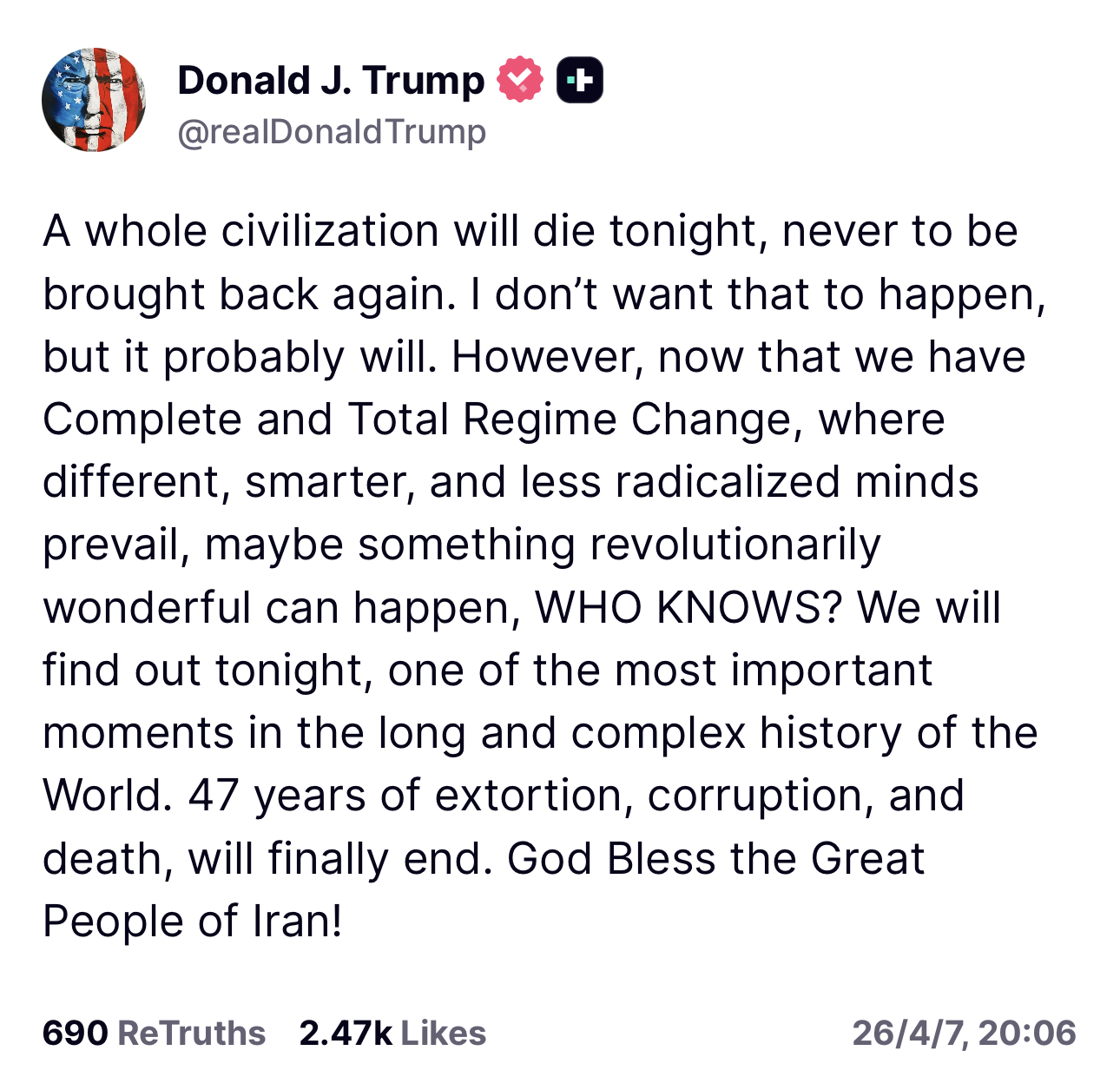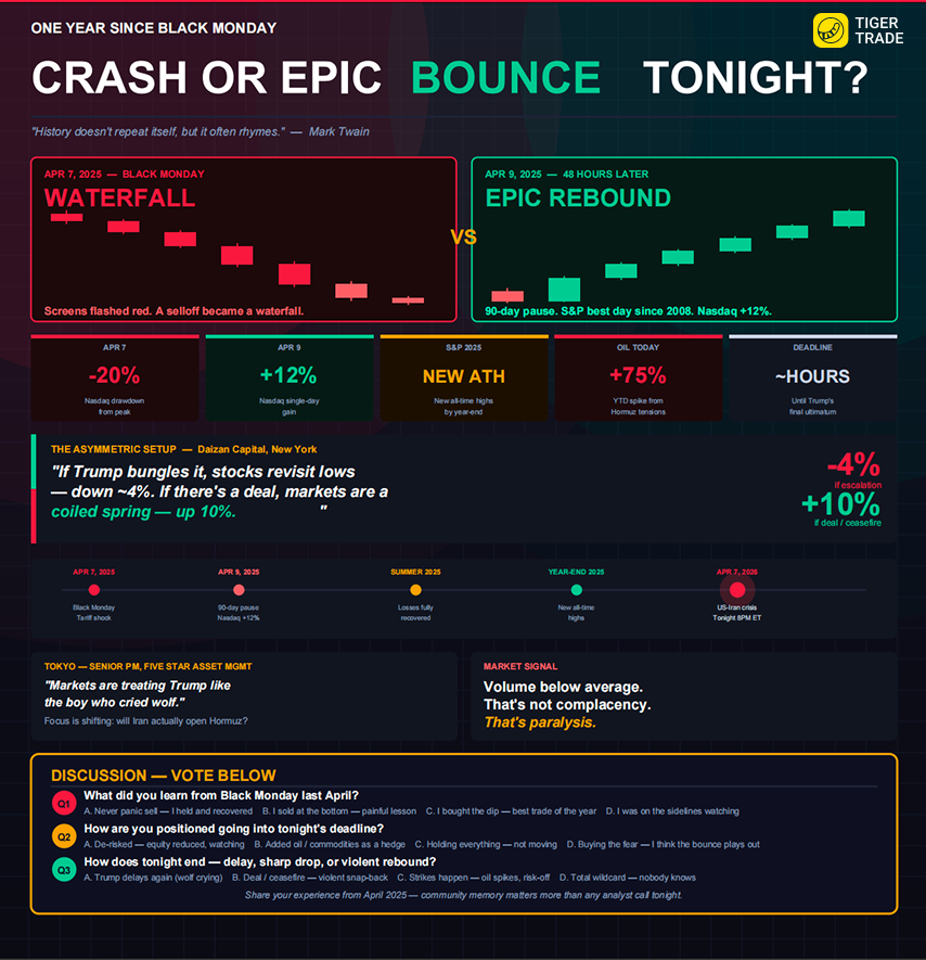 The setup rhymes with last April. But this time, the variables are different. This isn't a tariff which Trump can decide. This is geopolitical brinkmanship with a hard deadline — 8:00 PM ET tonight (April 8 — Wednesday 8:00 AM Singapore time) — and two very different outcomes on the table.
