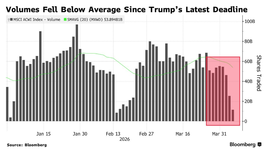 Volume has been running below average since the latest ultimatum. That's not complacency — it's paralysis. Nobody wants to be wrong-footed twice.