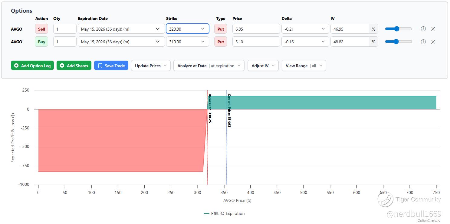 Logic: Broadcom traded near $314 just a week ago. This spread places your "danger zone" at a price level the stock has already proven it can defend, even during higher tension.
