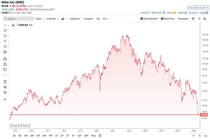 Nike $NKE headed for its lowest closing price in 12 years 📉📉