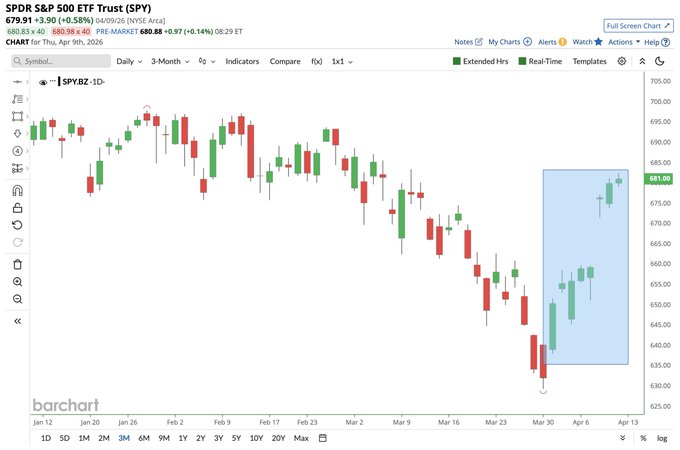S&P 500 $SPY on track for its 8th consecutive green day, its longest winning streak since April/May 2025 📈📈