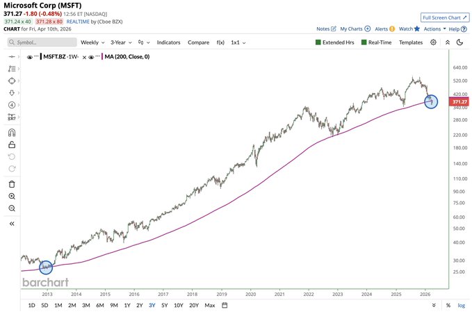 Microsoft $MSFT on track for its 3rd consecutive weekly close below its 200-week moving average 📉📉 The last time this occurred was more than 13 years ago 🤯👀