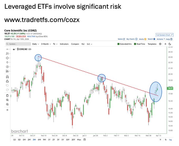Core Scientific $CORZ breaks above resistance on an 8-day winning streak, its longest in history ✅ That is strength 🚨 How high is this headed? For magnified exposure, consider the Tradr 2X Long CORZ Daily ETF $COZX
