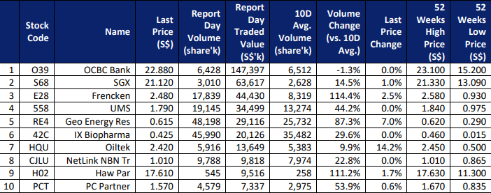 $OCBC Bank(O39.SI)$ $SGX(S68.SI)$ $Frencken(E28.SI)$ $UMS(558.SI)$ $Geo Energy Res(RE4.SI)$ $IX Biopharma(42C.SI)$ $Oiltek(HQU.SI)$ $NetLink NBN Tr(CJLU.SI)$ $Haw Par(H02.SI)$ $PC Partner(PCT.SI)$