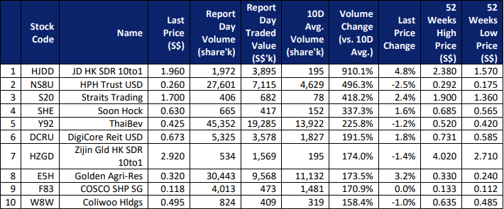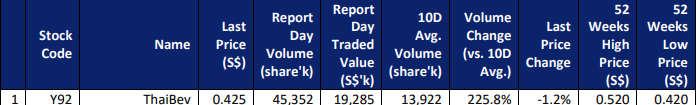$JD HK SDR 10to1(HJDD.SI)$ $HPH Trust USD(NS8U.SI)$ $Straits Trading(S20.SI)$ $Soon Hock(SHE.SI)$ $ThaiBev(Y92.SI)$ $DigiCore Reit USD(DCRU.SI)$ $Zijin Gld HK SDR 10to1(HZGD.SI)$ $Golden Agri-Res(E5H.SI)$ $COSCO SHP SG(F83.SI)$ $Coliwoo Hldgs(W8W.SI)$