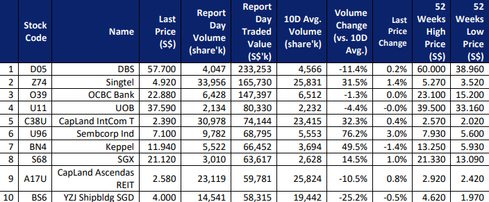 $DBS(D05.SI)$ $Singtel(Z74.SI)$ $OCBC Bank(O39.SI)$ $UOB(U11.SI)$ $CapLand IntCom T(C38U.SI)$ $Sembcorp Ind(U96.SI)$ $Keppel(BN4.SI)$ $SGX(S68.SI)$ $CapLand Ascendas REIT(A17U.SI)$ $YZJ Shipbldg SGD(BS6.SI)$