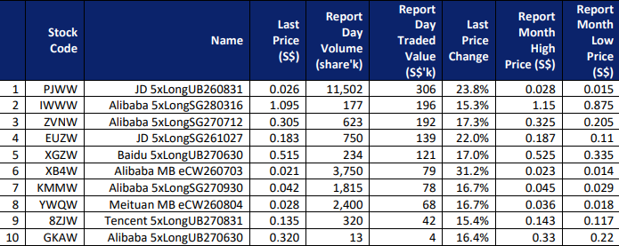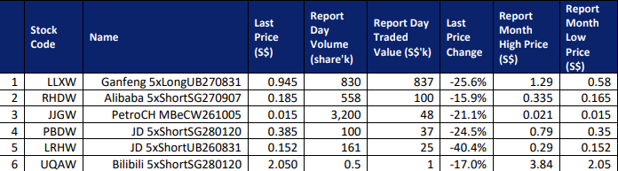 $Ganfeng 5xLongUB270831(LLXW.SI)$ $Alibaba 5xShortSG270907(RHDW.SI)$ $PetroCH MBeCW261005(JJGW.SI)$ $JD 5xShortSG280120(PBDW.SI)$ $JD 5xShortUB260831(LRHW.SI)$ $Bilibili 5xShortSG280120(UQAW.SI)$