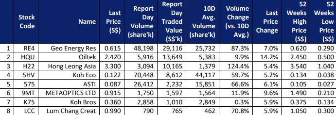 $Geo Energy Res(RE4.SI)$ $Oiltek(HQU.SI)$ $Hong Leong Asia(H22.SI)$ $Koh Eco(5HV.SI)$ $ASTI(575.SI)$ $METAOPTICS LTD(9MT.SI)$ $Koh Bros(K75.SI)$