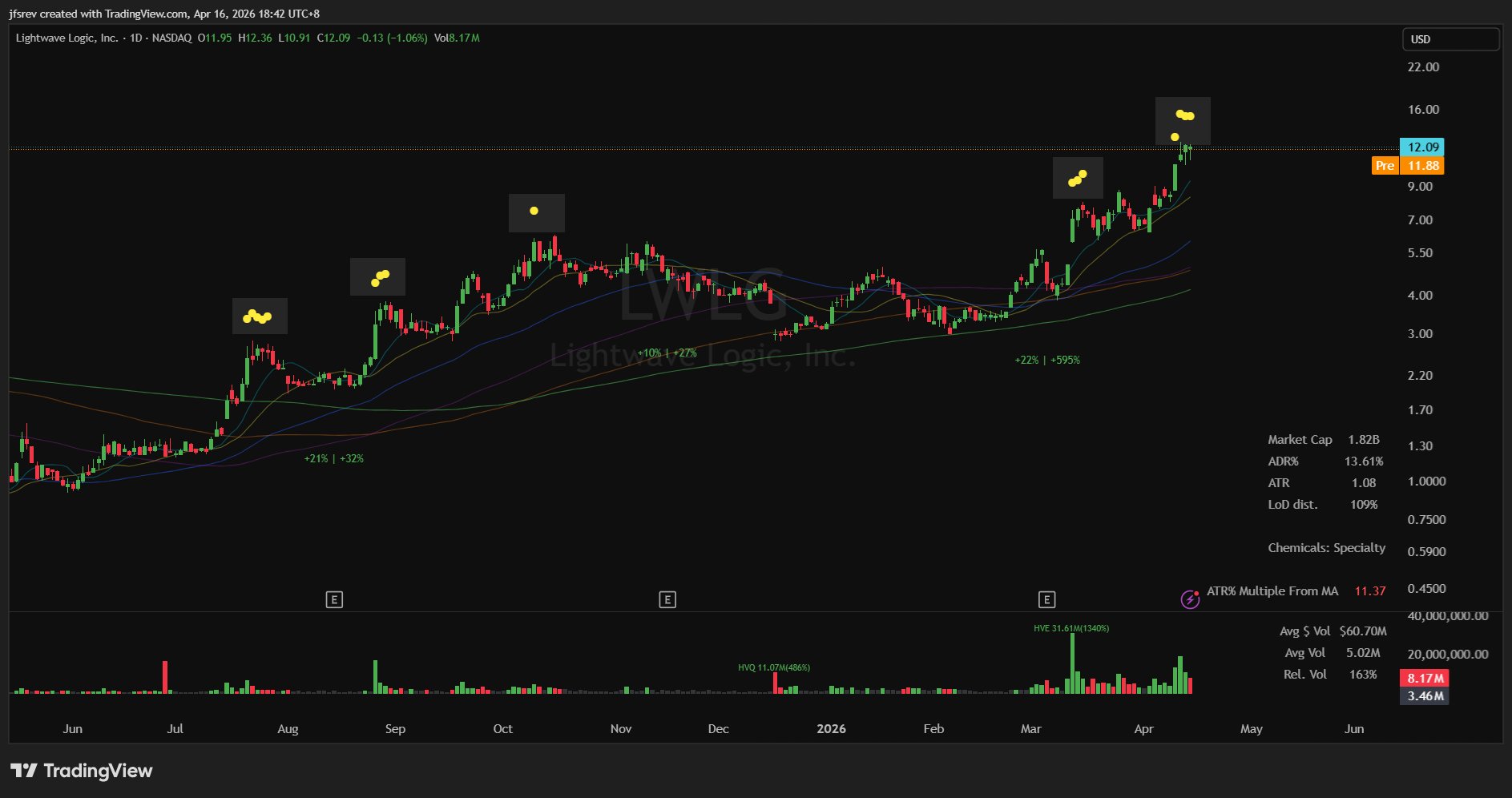 $LWLG — 5th instance crossing 10x ATR% move from the 50-MA within a year.