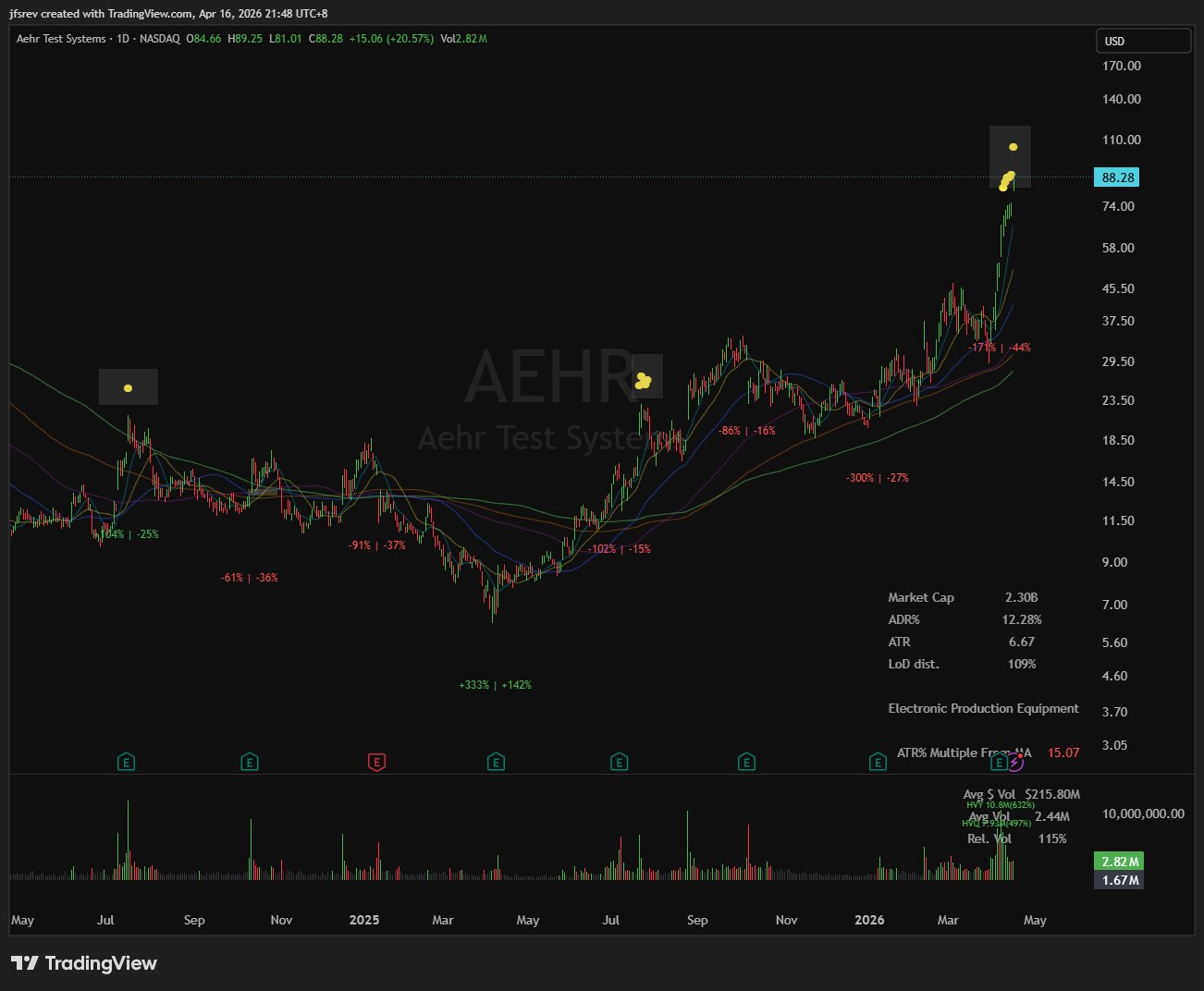 $AEHR — Gapped to ~15× ATR% from the 50-MA, likely due for a pullback similar to $Marvell Technology(MRVL)$ within the semiconductor ecosystem
