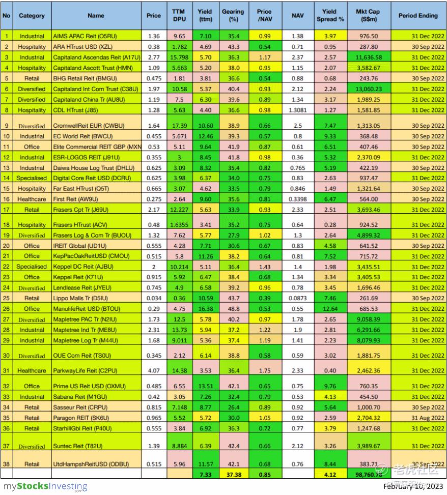 The following is the compilation of 38 Singapore REITs with colour-coding of the Distribution Yield, Gearing Ratio and Price to NAV Ratio.