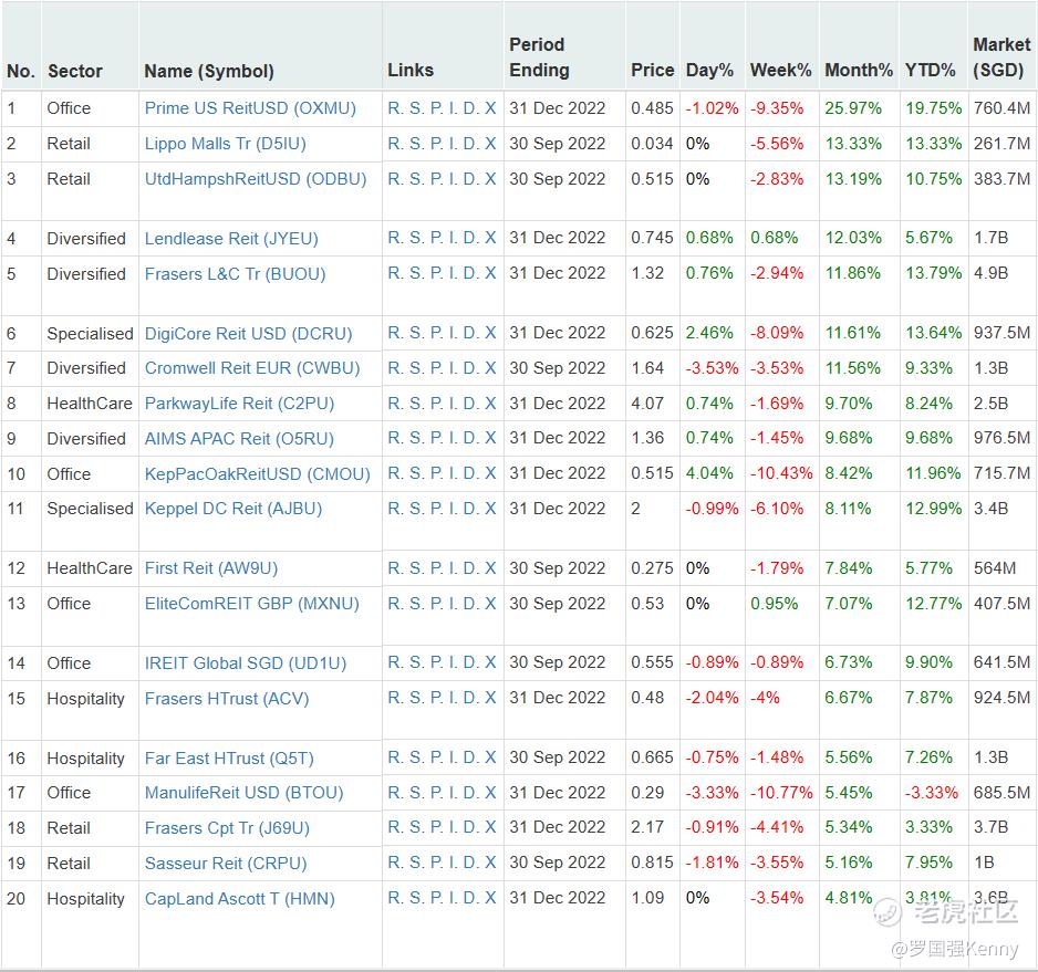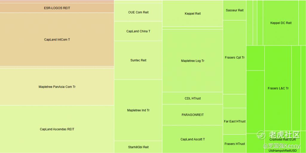 Interestingly, despite 24 REITs being bearish and only 10 REITs being bullish in the past month, market cap overall has increased very slightly by 0.26%.This is due to larger market cap REITs doing well (eg. $凯德雅诗阁信托(HMN.SI)$ (S$3.5B, 11.11%), $ESR-REIT(J91U.SI)$ (S$2.5B, 7.25%), $Frasers Centrepoint Trust(FRZCF)$ (S$3.6B, 3.45%).Only 3 of the bottom 12 performing REITs have market capitalisations of over S$1B. The top 5 largest Market Cap REITs have performances varying between -0.45% and -2.34%.
