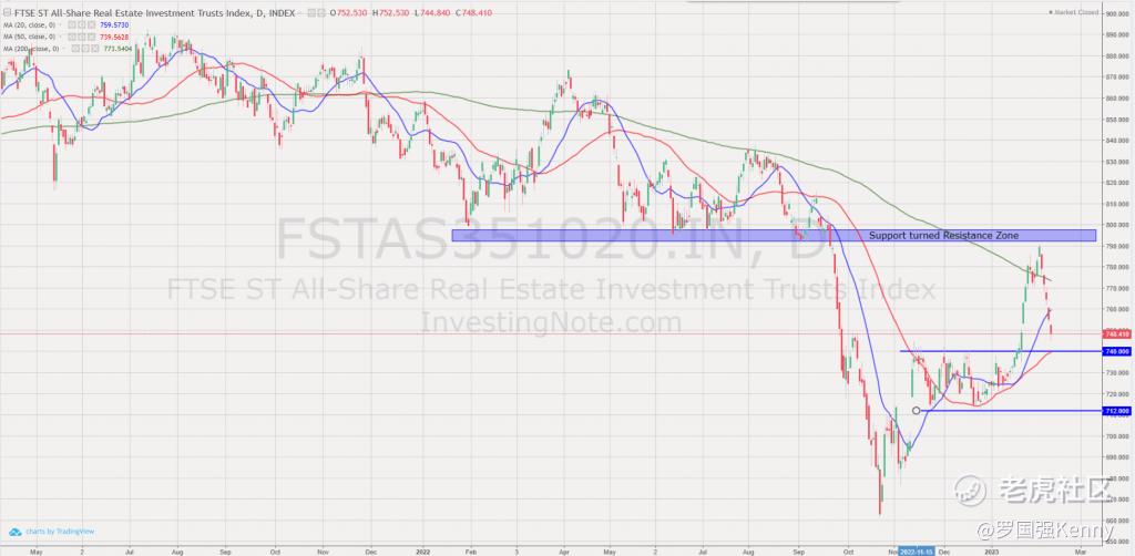 (Technically, FTSE ST REIT Index is trading in a short-term uptrend channel (higher high, higher low chart pattern) since finding the bottom in Oct 2022. After breaking up from the bull flag pattern, the S-REIT index is currently retracing to test the previous resistance turned support at about 740. If this support holds, it is expected the S-REIT index to continue the bullish rebound with the next target 790-800 to breakout to enter into bull market.
