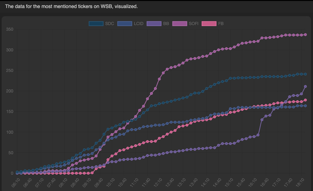 Here's the data of ticker mentions throughout the day, visualized. We can see the exact moment BB took off after-hours and when SOFI reall started to pick up momentum.