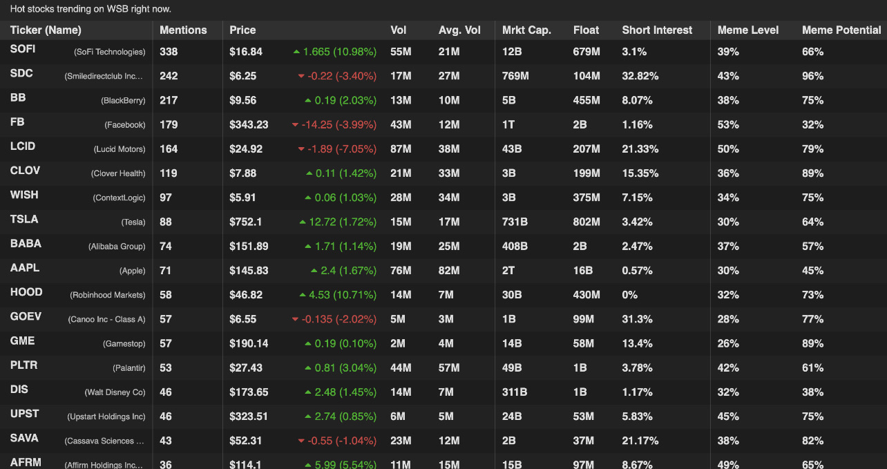a brand new list: SOFI, SDC, BB, FB, LCID