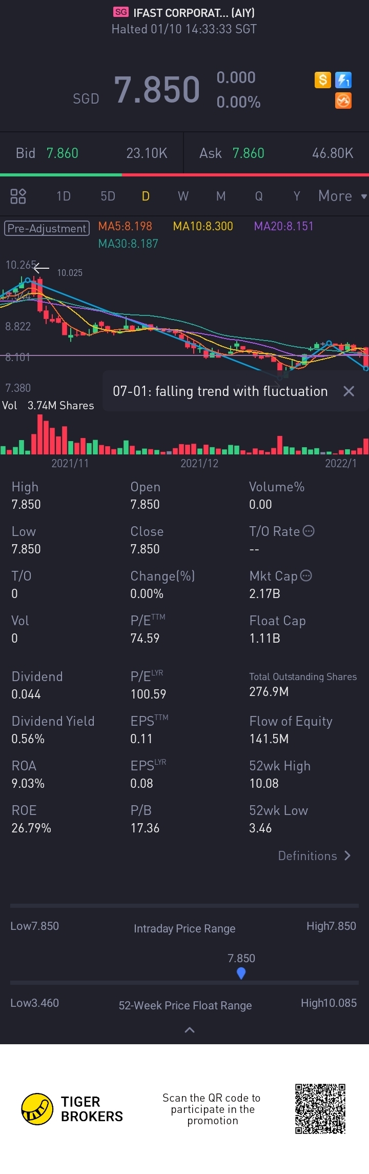 $IFAST CORPORATION LTD.(AIY.SI)$Given that the company is asking investors to fund for the acquisition of the bank, I feel that these are worse news than the analysts reducing their TP for iFast.