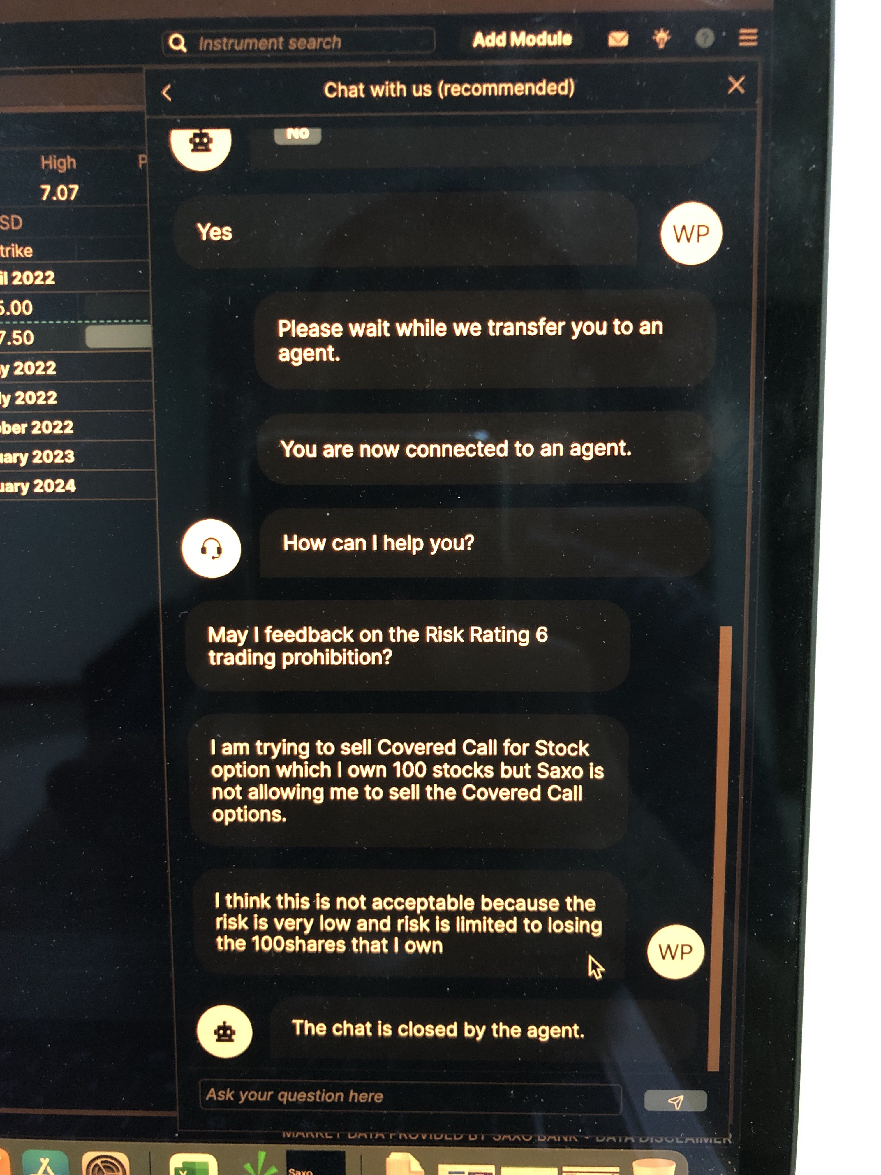 This is the quality of Saxo's customer chat service support. The service agent just endedthe chat when I complained. Damn!!!!