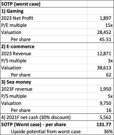 As highlighted below, my worst case SOTP target price for Sea Limited is now $131.77, with an upside potential of 36% to the worst case target price. This takes into account: