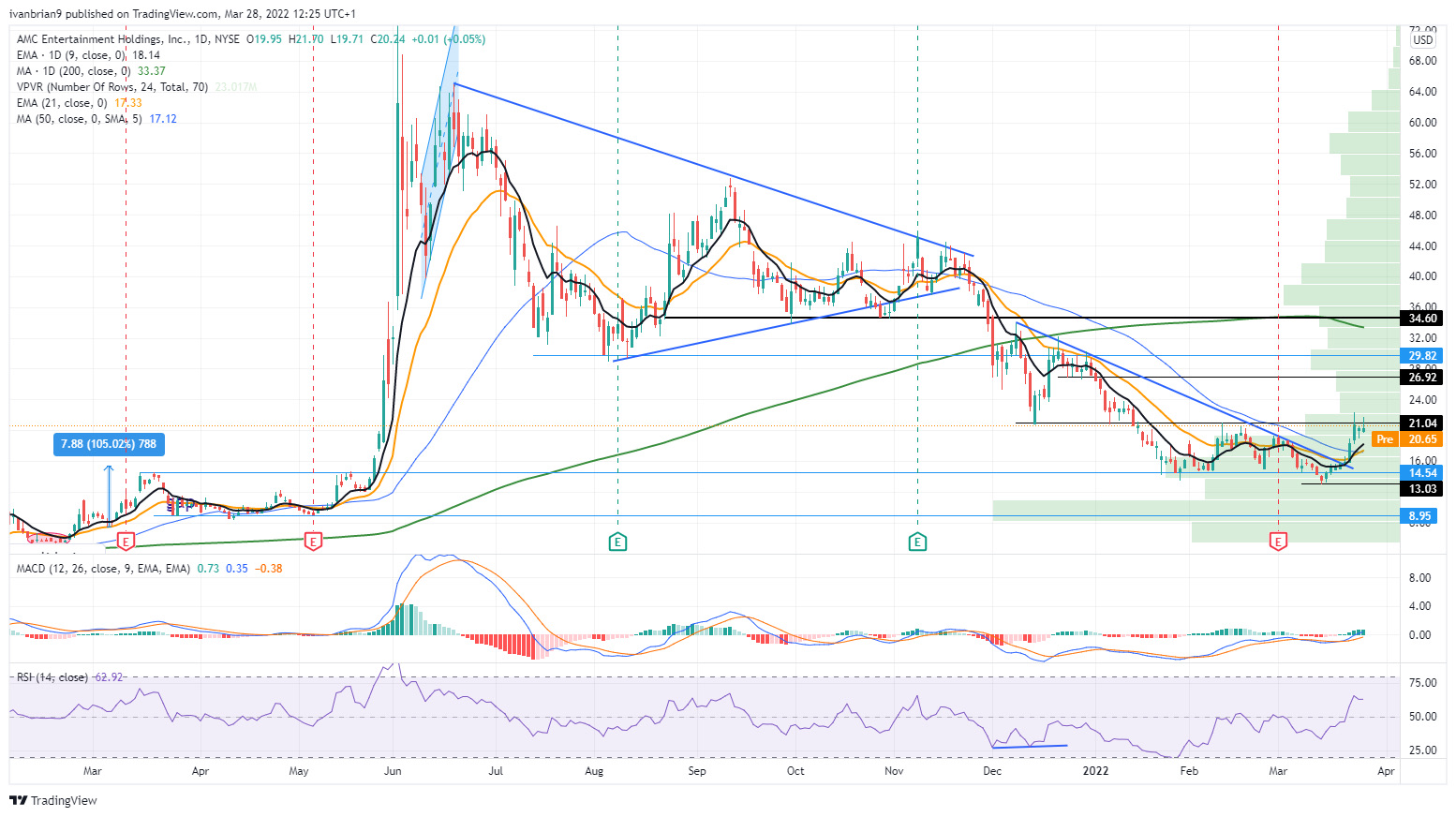 On the daily chart, we still need to cleanly break above the $21.04 resistance and close above it. Doing that will then open up a move to $26.92. More importantly, it ends the longer-term bearish trend. This may then attract CTA and trend-following funds into the trend's formation or at least stop trend-following sell programs. Now I am bearish on AMC stock from here and am long some puts. I know some of you will not like to read that, but it is a longer-term view. I tend to trade from a fundamental macro backdrop, and I see trouble ahead for the stock market. AMC should hold up in the short term, but longer term I am not as confident. If AMC apes manage to close above the resistance level at $21.04 that I mentioned, then I might close the position.