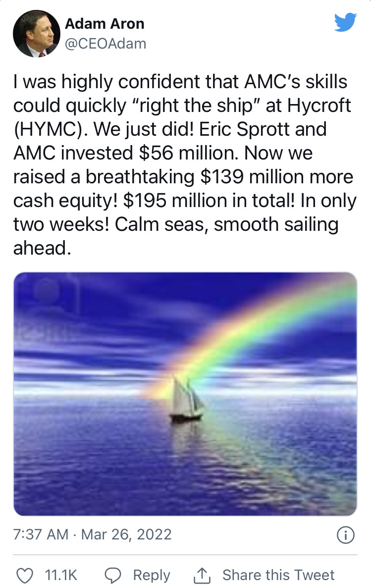 CEO Adam Aron tweeted over the weekend that more deals are on the way in the meme stock space after the success of the Hycroft Mining (HYMC) deal. AMC entered the world of gold mining with a small investment in Nevada miner Hycroft Mining just two weeks ago. This once small-time gold miner with financial difficulties hit paydirt last week as it managed to raise $139 million via share placing.