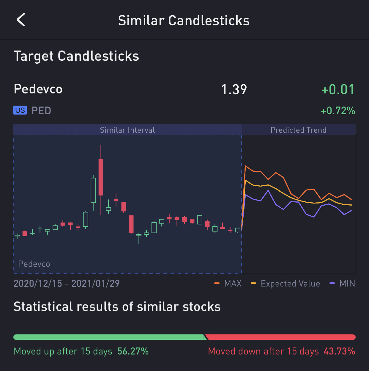 $Pedevco(PED)$I like what I see, chart is lookingvery beautiful and Pedevco seems to be building up for a bullish move! The first picture that uses Tiger's 'similar candlesticks' feature suggests a squeeze up to $2 levels, and the last time I used the 'similar candelsticks' feature, Tiger's prediction proved to be accurate with $Hycroft Mining Holding Corporation(HYMC)$as an example, as the prediction suggested a strong bullish move to $3 levels which eventually happened!