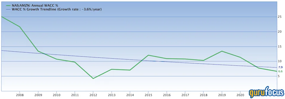Amazon has a weighted average cost of capital of 6.61% and a cost of equity of 7.945%. The cost of equity (otherwise known as CAPM) provides investors with an indication of the expected return on the stock, given its sensitivity to the market's risk premia and the 10-year yield.