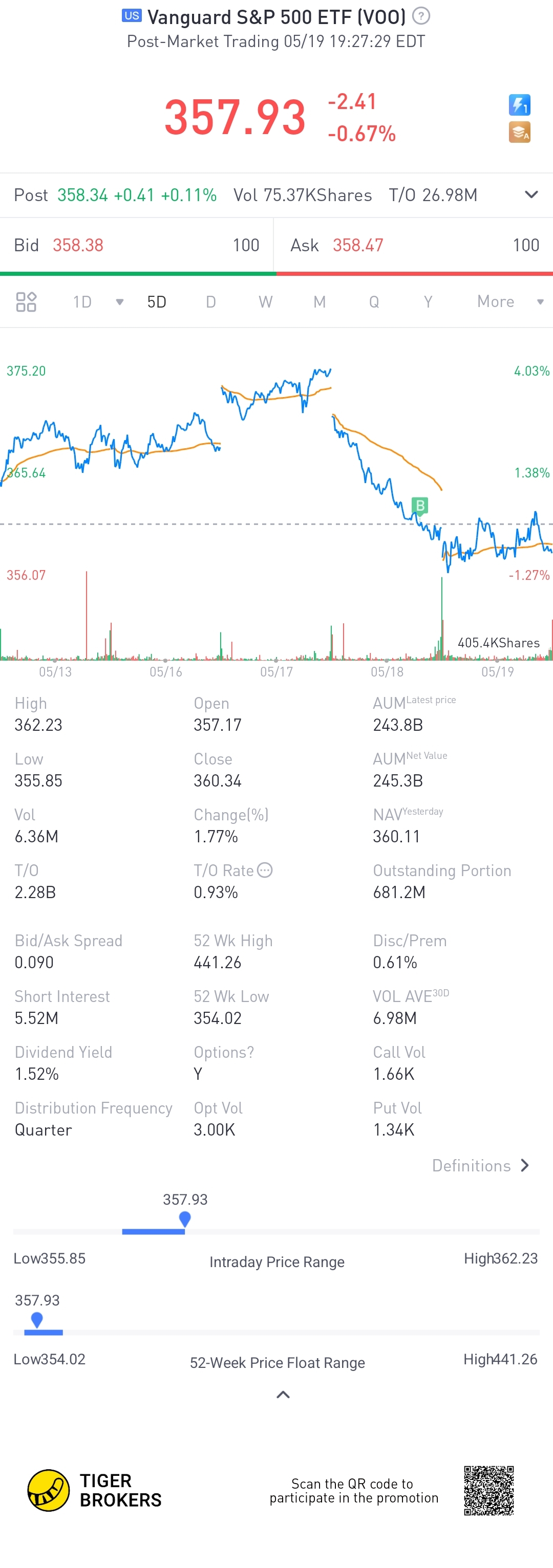 $Vanguard S&P 500 ETF(VOO)$expected to be have a slight renounce today. Let's see if the signal is strong for a recovery hook next week. Btw this is the 7th red candlestick on a weekly chart. [Grin]