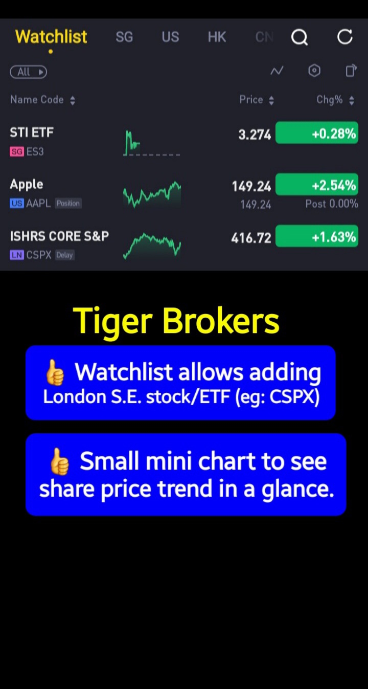 (a) Tiger's Watchlist is useful & thoughful, as stocks/ETFs listed in London Stock Exchange can be added into your watchlist. The small mini chart can be displayed to see the share price trend/movement in a glance.