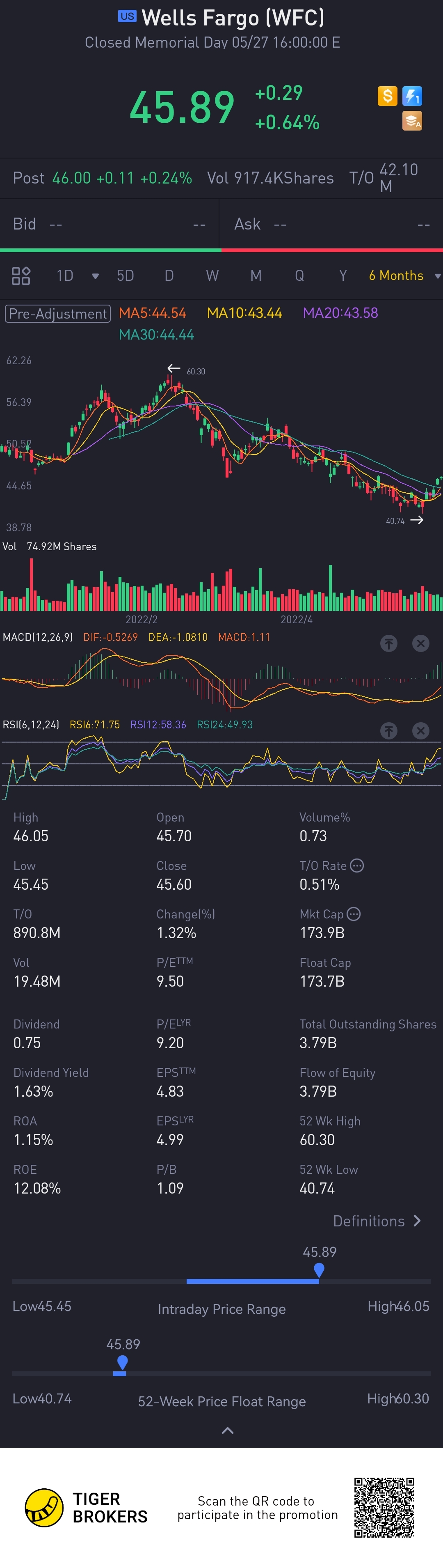 $Wells Fargo(WFC)$Wells Fargo & Company is a financial services company. The Company provides a diversified set of banking, investment and mortgage products and services, as well as consumer and commercial finance, through banking locations and offices, the Internet (www.wellsfargo.com) and other distribution channels to individuals, businesses and institutions in states, the District of Columbia and in countries outside the United States. The Company provides consumer financial products and services, including checking and savings accounts, credit and debit cards, and auto, mortgage and home equity, and small business lending. In addition, the Company offers financial planning, private banking, investment management, and fiduciary services. The Company also provides financial solutions to businesses through products and services including traditional commercial loans and lines of credit, letters of credit, asset-based lending, trade financing, treasury management, and investment banking services.