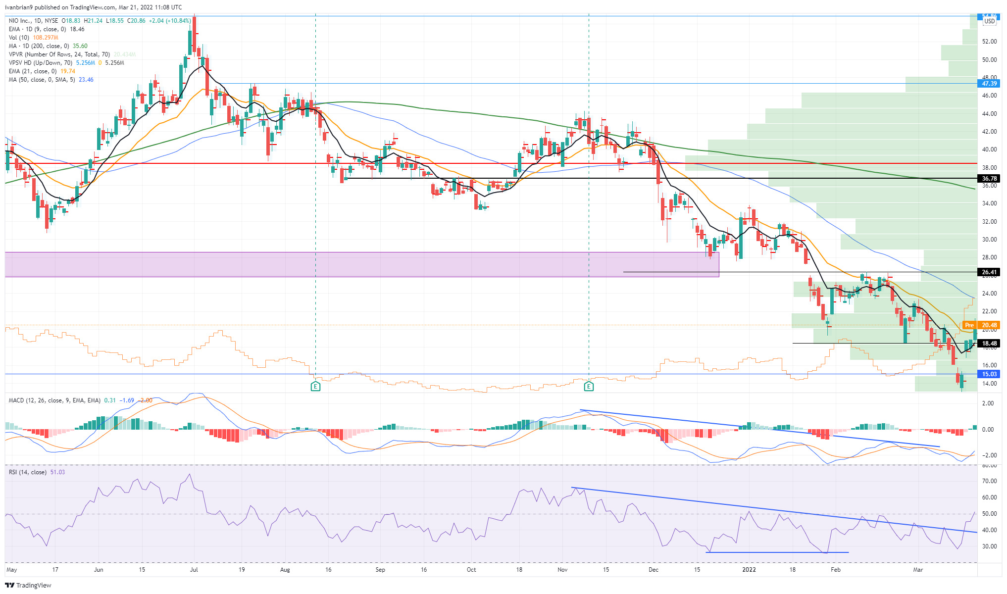 We had for some time a bullish divergence on the Relative Strength Index (RSI), but the NIO share price kept on falling, so the timing was difficult. Now the sharp move higher has seen the RSI break out of the long-term downtrend. This signals that a possible bottom is in place. The Moving Average Convergence Divergence (MACD) too has broken out. Holding $18.48 is key. The next resistance is the 50-day moving average at $23.46, followed by $26.41