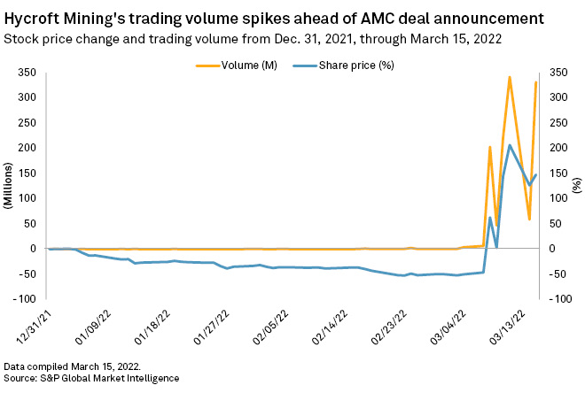 Investors responded favorably to the deal news, launching Hycroft shares 37% following the announcement. However, the price spike may have been impacted by heavy trading leading up to the deal. Trading volume for Hycroft spiked beginning March 7, a week before the announcement, and increased to nearly 350 million shares exchanged in a single day from average daily shares volumes well below 1 million. No public news or filing corresponded to the leap in activity March 7. Hycroft's stock hit a 52-week low March 2.