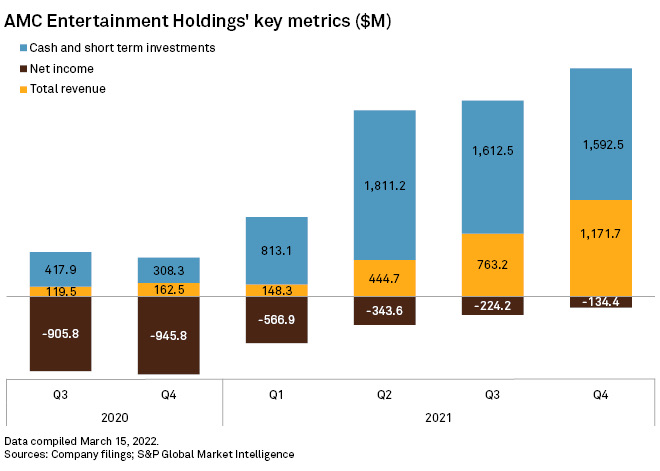 Moviegoers are returning to theaters after two years of closures, capacity limits and low supply film output from studios, but AMC is still operating in the red. The company reported a $134.4 million net loss against $1.17 billion in revenue in the fourth quarter of 2021.