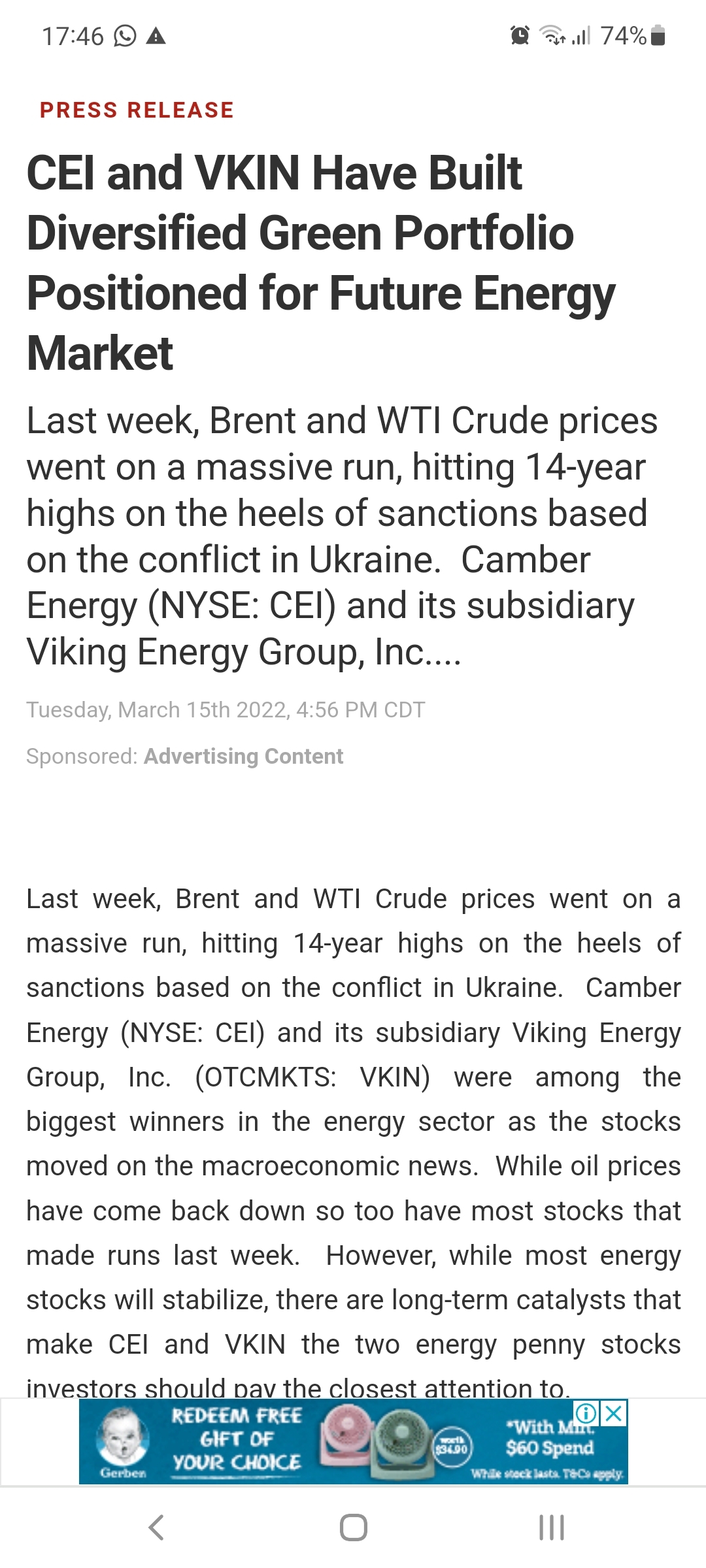 $Camber Energy(CEI)$For reading -- "CEI and VKIN Have Built Diversified Green Portfolio Positioned for Future Energy Market"