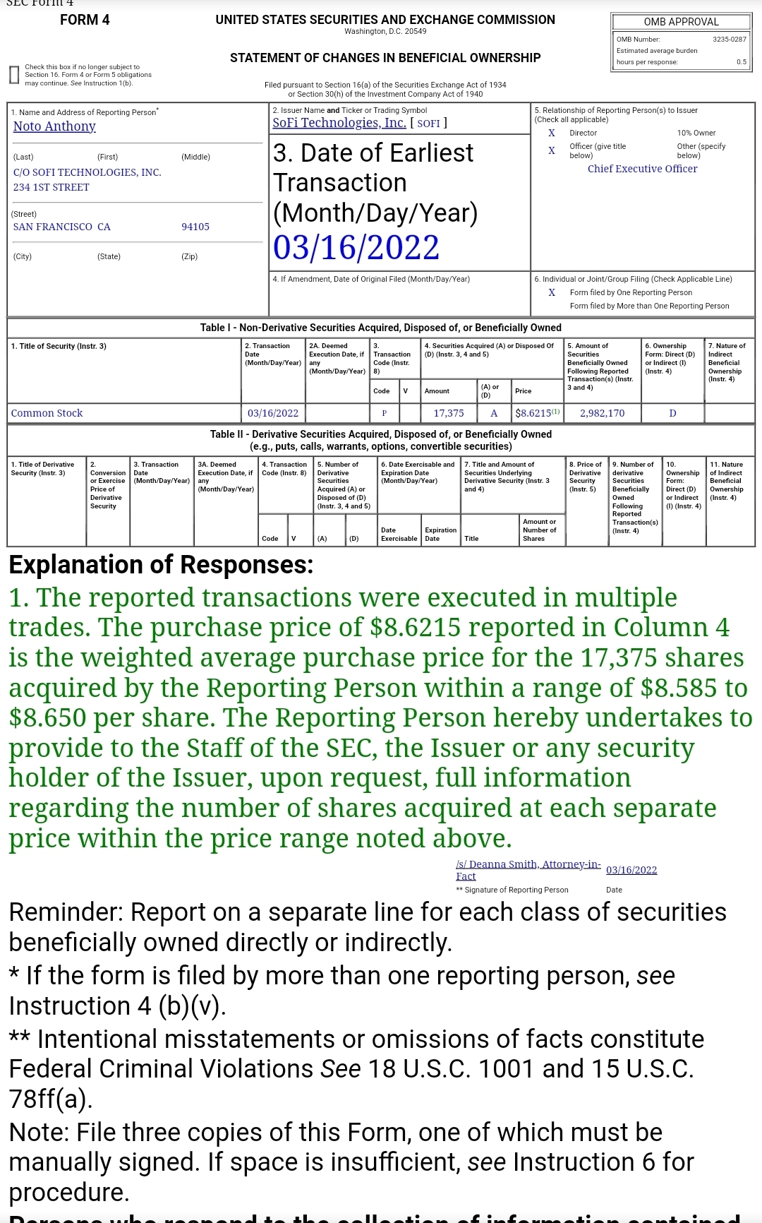 05:36 PM EDT, 03/16/2022 (MT Newswires) -- Anthony Noto, Director, Chief Executive Officer, on March 16, 2022, executed a purchase for 17,375 shares in SoFi Technologies (SOFI) for $149,799. Following the Form 4 filing with the SEC, Noto has control over a total of 2,982,170 shares of the company, with 2,982,170 shares held directly. The market value of the direct and indirect holding, based on the transaction price, is approximately $25,710,779.