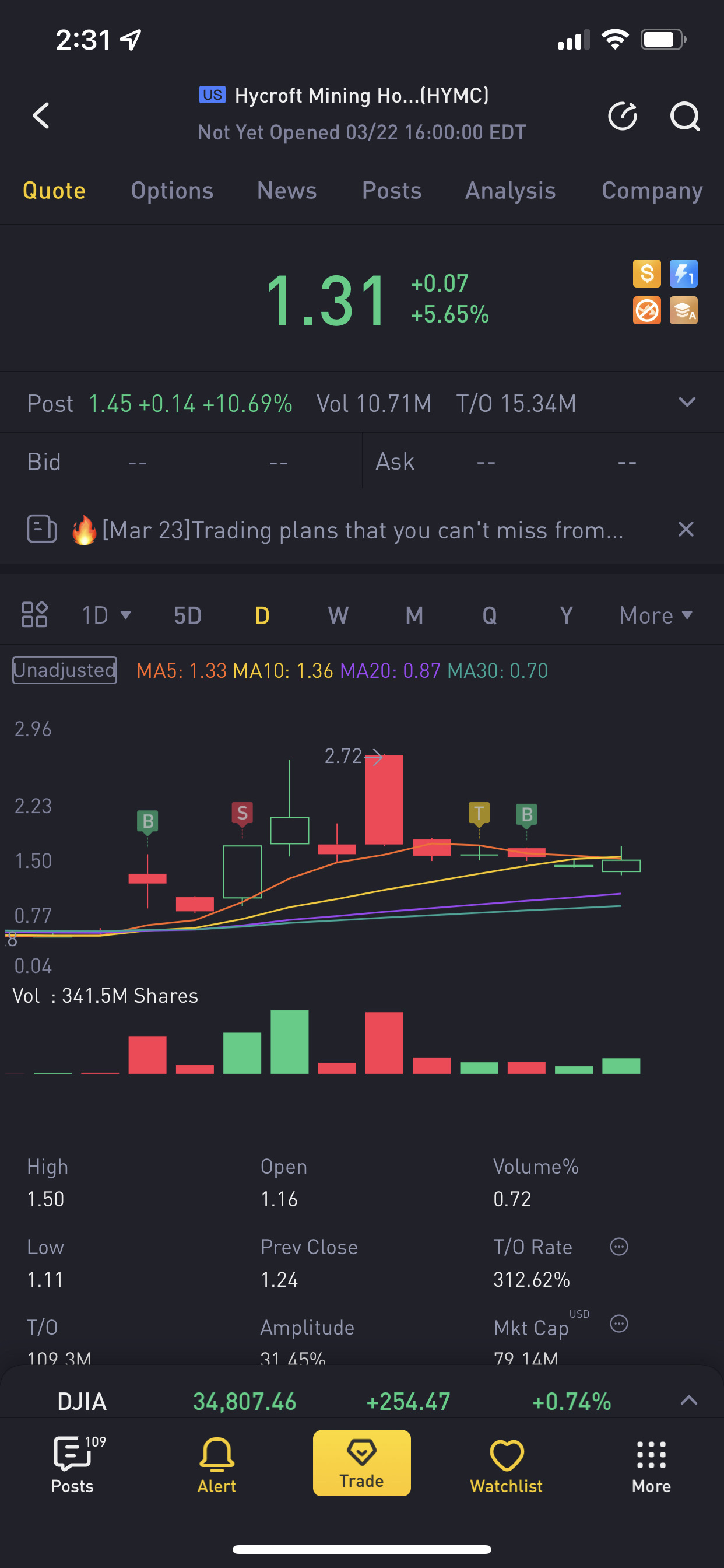 $Hycroft Mining Holding Corporation(HYMC)$Expecting another squeeze soon here, judging by the charts and fundamentals we need more volumeand some positive indicator/news for HYMC to push up further. Next resistance level about 1.60-1.80, if broken can go up to $2.00 where another level of resistance will be expected! If only there was any positive news from HYMC, this will easily go up, and it's chart is similar to AMC, strong uptrend in AMC caused a strong uptrend in HYMC, so it's good to watch both of these stocks at the same time. Play safely, invest carefully and seeat what price there is resistance so you can carefully buy and sell, and you should be able to makemoney smartly! All the best to my fellow investors!