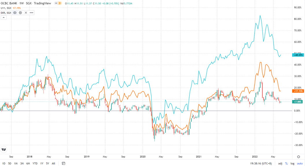 If we put all 3 banks together in 5 years chart, DBS is clearly winner with 49%, followed by UOB at 17%, last is OCBC 8%. They all have similar up/down performance.But for SG banks, no need to waste too much time on capital gain because most of US growth stocks will beat them easily. The focus is dividend!!! All three banks have good dividend yield! ๐