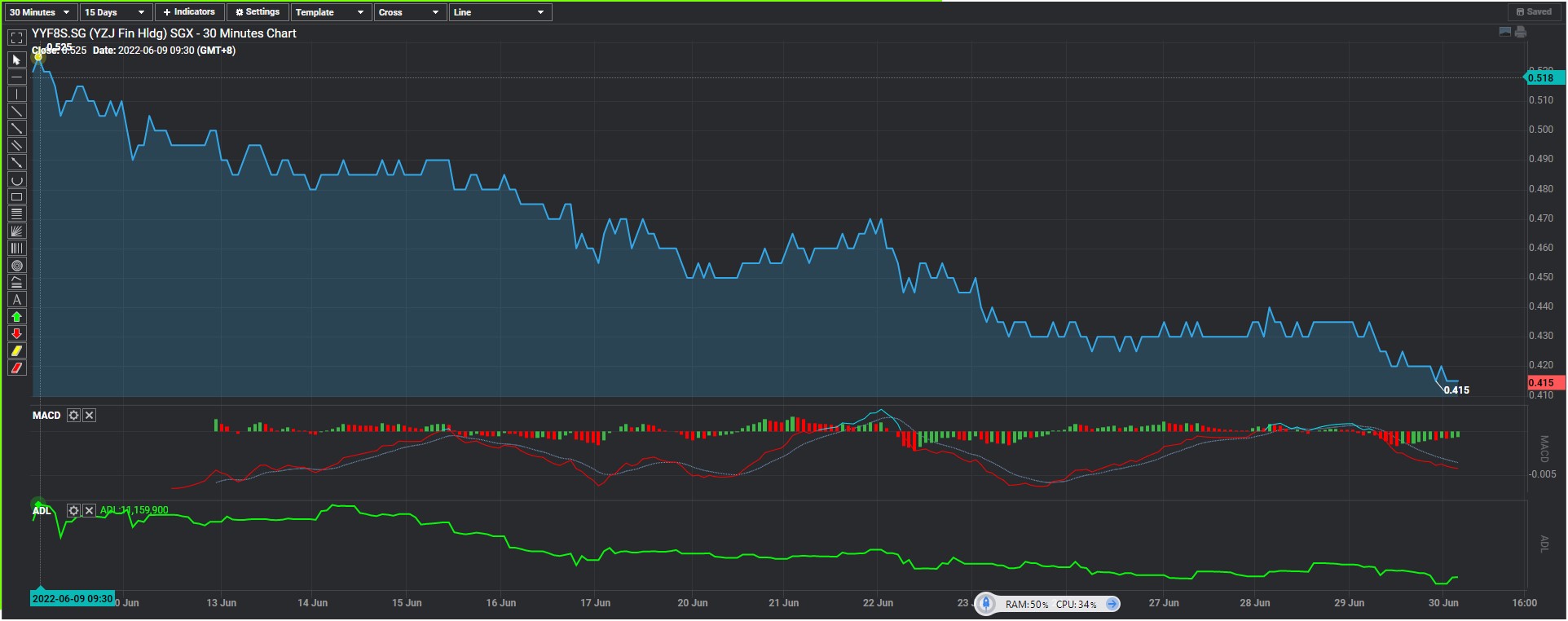 $YZJ Fin Hldg(YF8.SI)$Stock might test $0.39 (touched on 19 May) again if it needs to rebound moderately from current level. Right now, there is some divergence displaying in the MACD indicator. A technical rebound should be imminent soon.