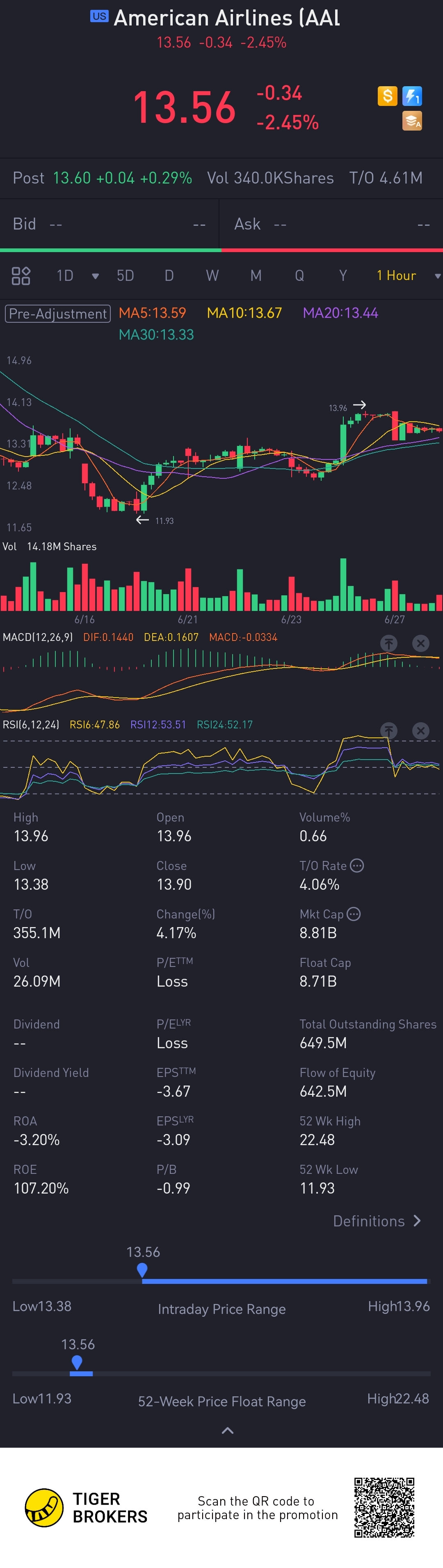 $American Airlines(AAL)$American Airlines Group Inc. is a holding company. The Company's primary business activity is the operation of a network air carrier, providing scheduled air transportation for passengers and cargo. It operates through American segment, which provides air transportation for passengers and cargo. The Company together with its regional airline subsidiaries and third-party regional carriers operates under American Eagle brand, providing scheduled air transportation for passengers and cargo through its hubs in Charlotte, Chicago, Dallas/Fort Worth, Los Angeles, Miami, New York, Philadelphia, Phoenix and Washington, District of Columbia (D.C.) and partner gateways, including in London, Madrid, Seattle/Tacoma, Sydney and Tokyo. Its subsidiaries include American Airlines, Inc., Envoy Aviation Group Inc., PSA Airlines, Inc. and Piedmont Airlines, Inc. Its cargo division provides a range of freight and mail services with facilities and interline connections available across the globe.