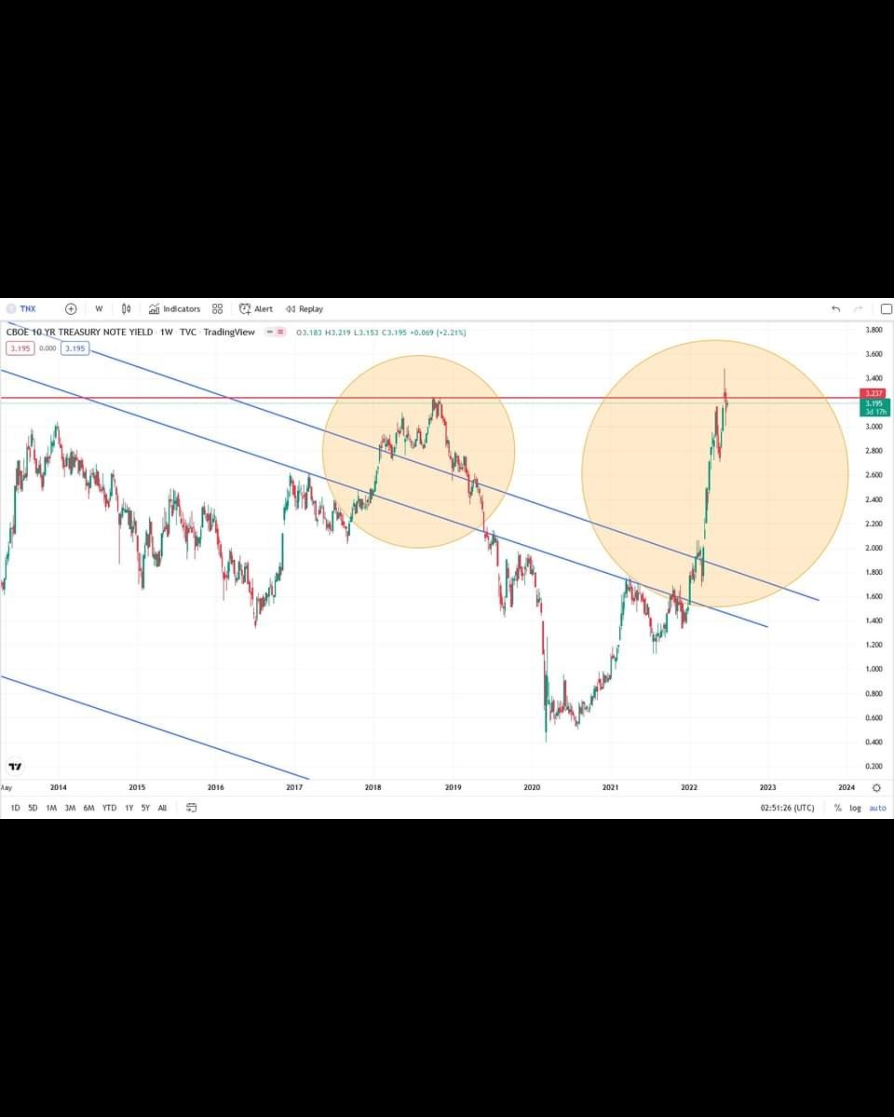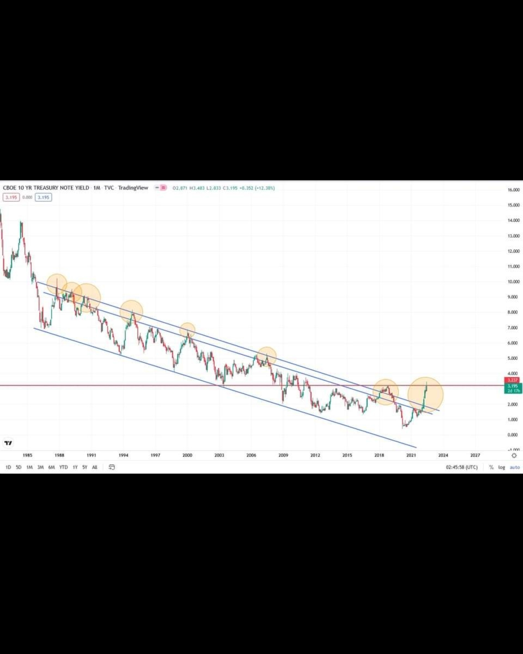 The bond market never lies. For the last 37 years, it has respected this "channel of truth", even in times of great crisis, including the GFC in 2008. This time round, it has not only sliced above the channel, it has broken through the 2018 resistance (red line) momentarily before dropping back, and is now on the way to test it again. The zoomed in chart provides a greater understanding of what bond traders really think. The panic and selloff for the S&P500 took place in Jan 2022, just as it sliced out of the channel.