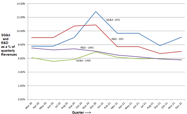For people who doubt the ability of a small U.S. foundry to compete on a global basis, check the operating expenses. Here, I noted that both SG&A (sales and admin) and R&D (research) expenses as a percentage of total revenues are in the 6% to 10% range for UMC and GFS, as shown in the chart below.