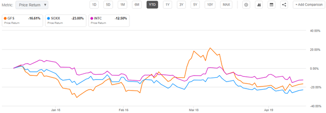 GlobalFoundries Inc.'s (NASDAQ: GFS) share price as shown in the orange chart below fell by more than 40% from March 25, but on a year-to-date basis, it suffered less than the iShares Semiconductor ETF (SOXX), which represents the wider sector. The same is the case with giant chip manufacturer Intel (INTC), as shown by the purple chart.