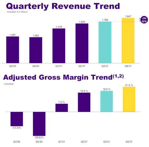 Going into details, except for the second part of 2020, when Covid-induced social distancing measures impacted production, the company has been incrementing sales sustainably. The fourth quarter of 2021 delivered revenues of $1.85 billion, or a74% y-o-y growth. Now, given that 2020 was a low year, the more meaningful sequential improvement of 9% (chart below) from Q3 to Q4 shows that the company has the necessaryinventoryof raw materials. Also, revenues beat analysts' expectations by$40 million.