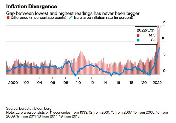 Inflation in the Eurozone is breaking record after record, but the gap between the highest and lowest rates among the 19 members of the currency bloc has also become the largest in history.