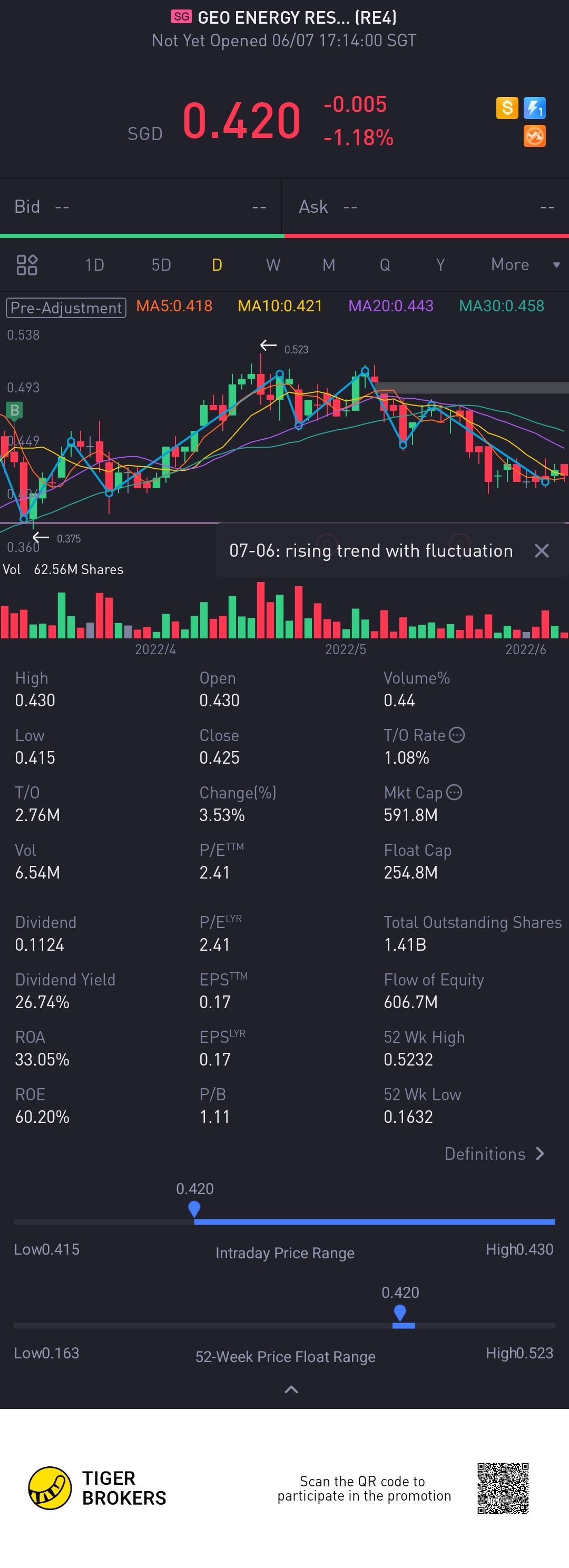 $GEO ENERGY RESOURCES LIMITED(RE4.SI)$have been coiling fir a few days at support levels..... Will buy in more today to await the next move. Future quarters are good for this company and even if I look at a wrist case scenario of 5 cents dividend for the next 2 quarters combined... we are still looking at more than 10 percent dividend for 6 months!  Annualised 20 percent...